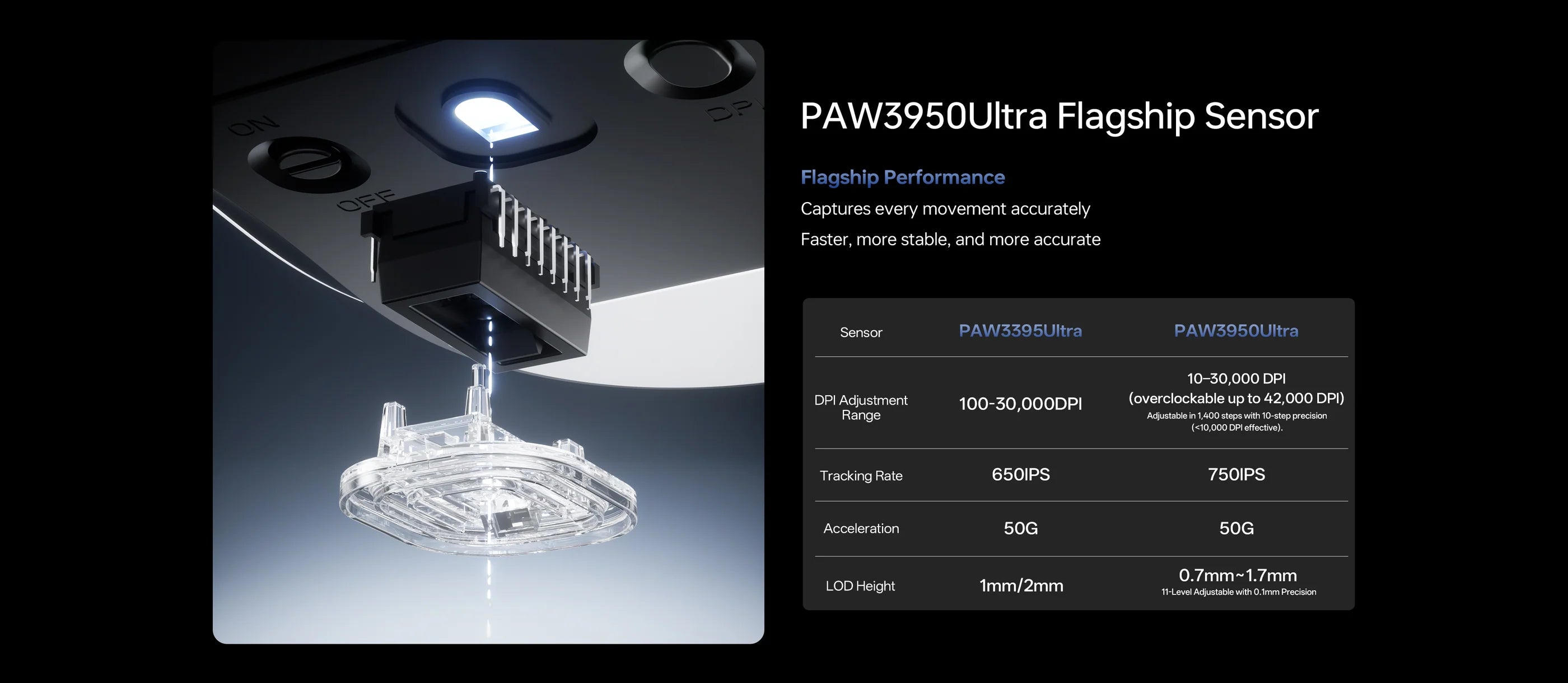 - Sensor: PAW3395 Ultra / PAW3950 Ultra