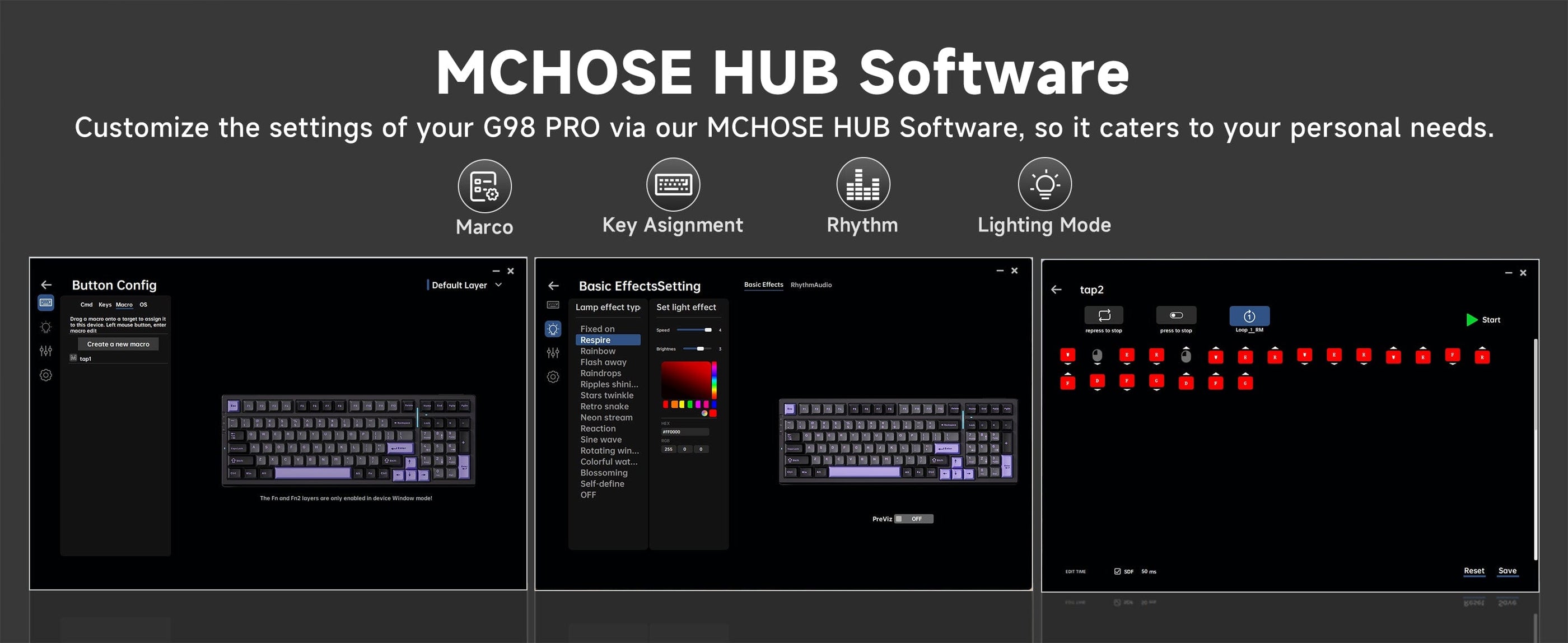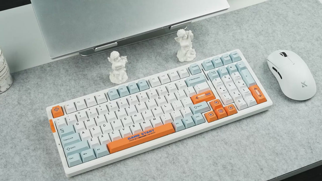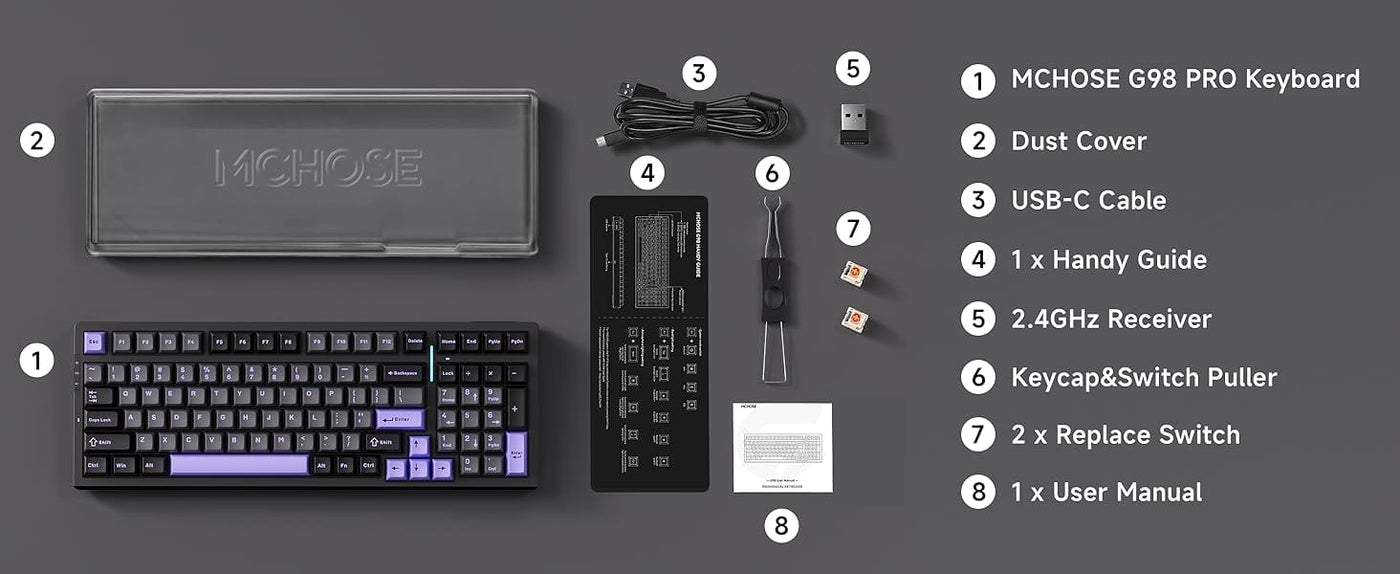 The MCHOSE G98 Pro is a premium 98% layout wireless mechanical keyboard featuring a hot-swappable gasket mount structure, tri-mode connectivity, ultra-low latency performance, and durable PBT double-shot keycaps.