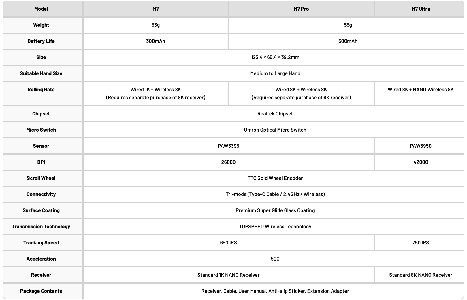 The M7 and M7 Pro feature the PAW3395 sensor, while the M7 Ultra is equipped with the PAW3950 sensor, it ensures seamless responsiveness and precision for serious gamers, it provides: