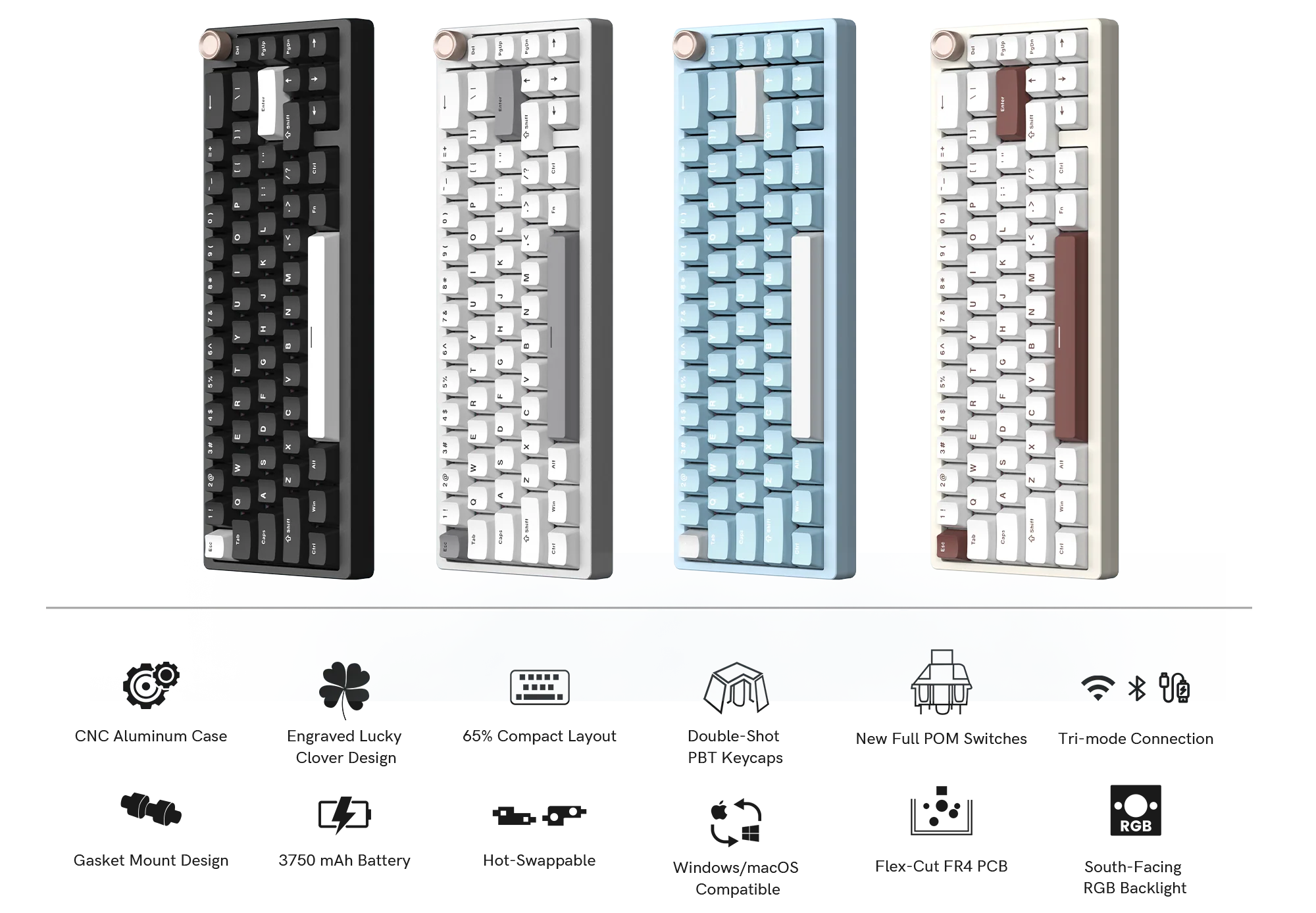 - PCB: FR4 material, support custom driver, full RGB, hotswap, with flex cuts, 3/5 pin switches compatible