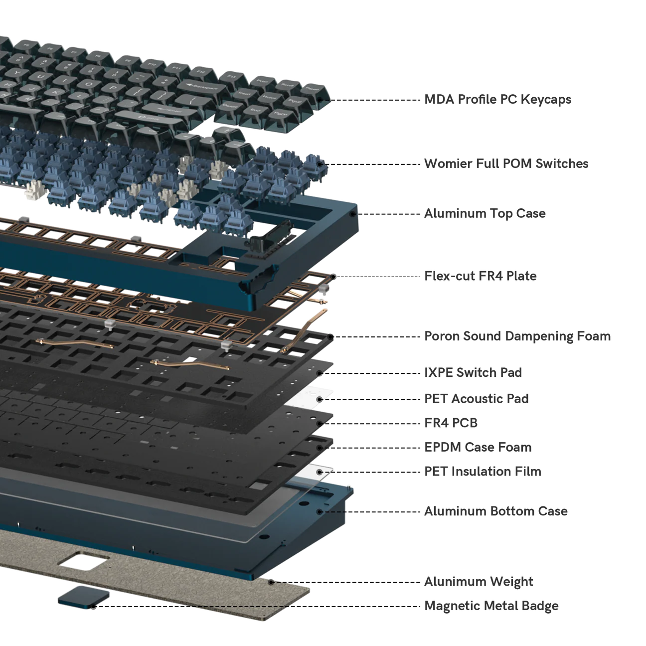 - Switches: Womier POM Navy (Anodized Blue version)/POM Ink switches (Anodized Black version)