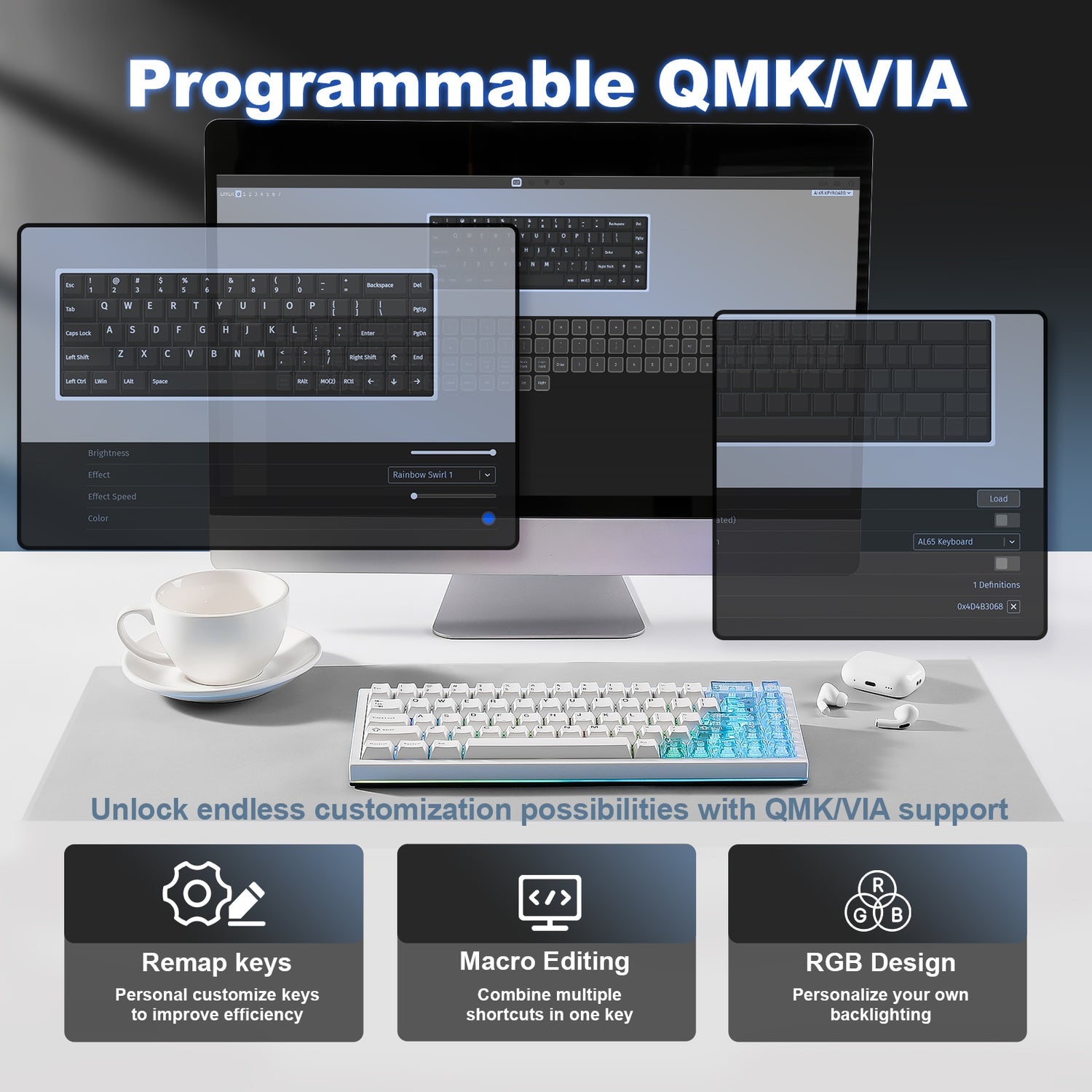 The YUNZII AL65 gaming keyboard supports QMK/VIA software, enabling seamless key remapping, macro, and RGB customization. Compatible with Windows and macOS, this custom aluminum mechanical keyboard uses an open-source customization platform, providing unparalleled flexibility and empowering users to create a personalized typing and gaming experience.